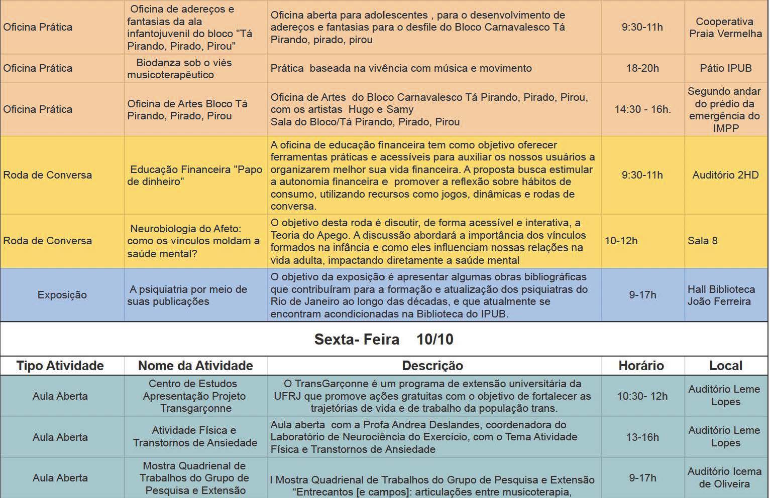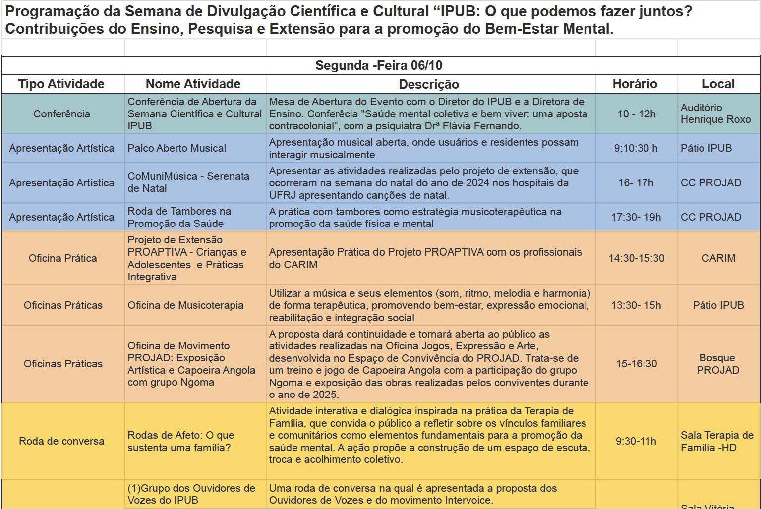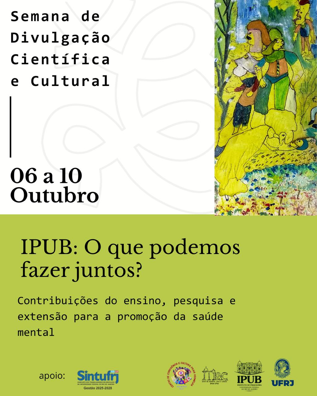Entre os dias 6 e 10 de outubro, o IPUB abre suas portas com atividades gratuitas que unem ciência, arte e cultura.Durante cinco dias, mais de 50 atividades ocuparão os espaços do IPUB e do território da Praia Vermelha, reunindo práticas, saberes e iniciativas científicas, educativas e culturais sobre saúde mental. Exposições, exibição de documentários, apresentações artísticas, palestras, aulas abertas, rodas de conversa, oficinas e pôsteres integram a programação plural e diversa.