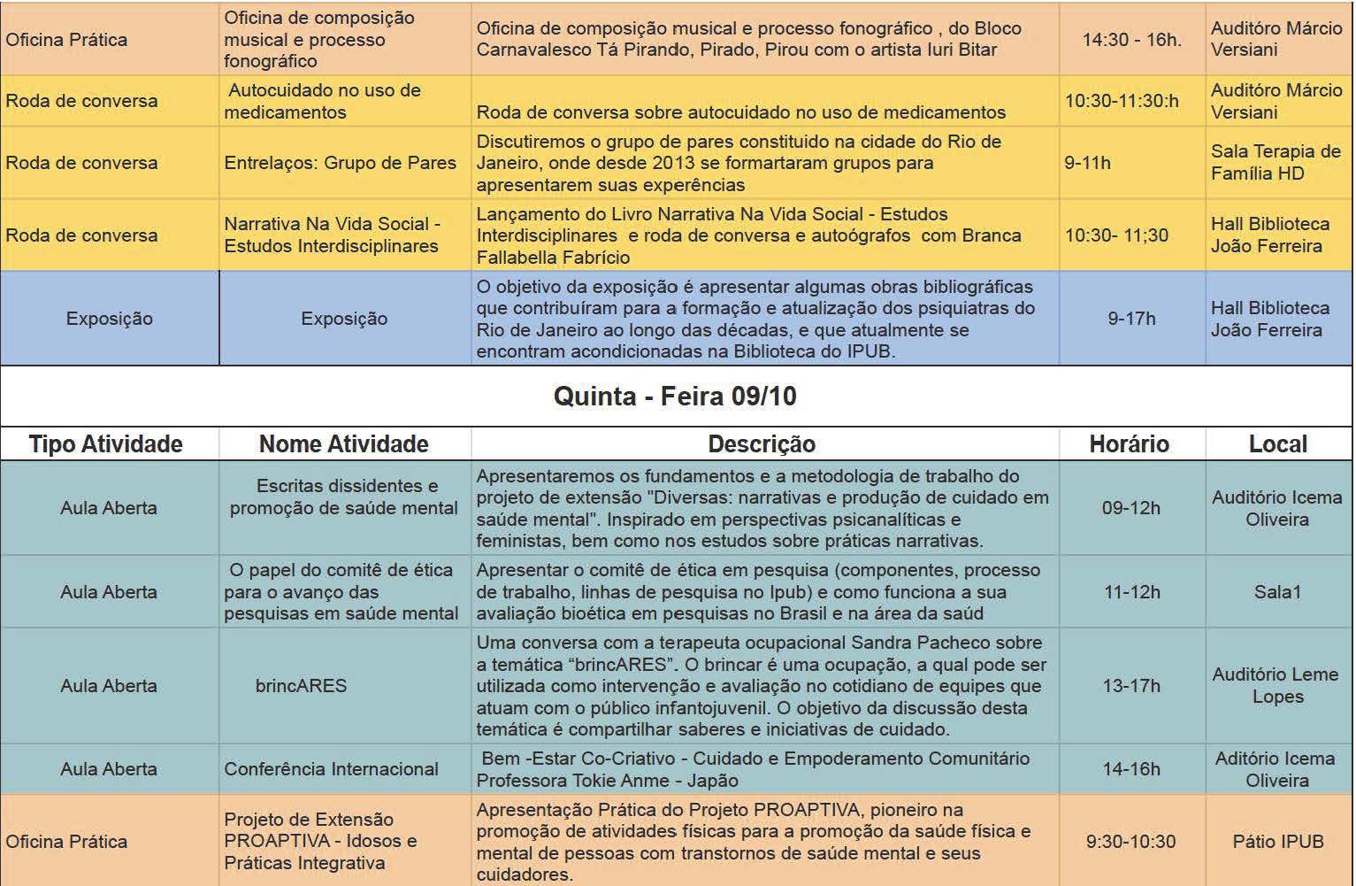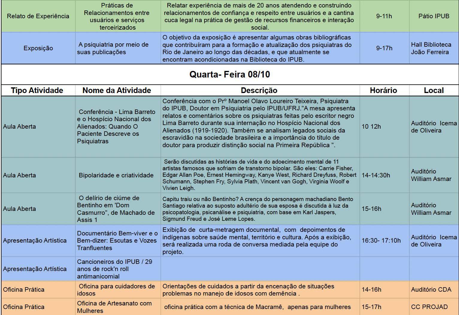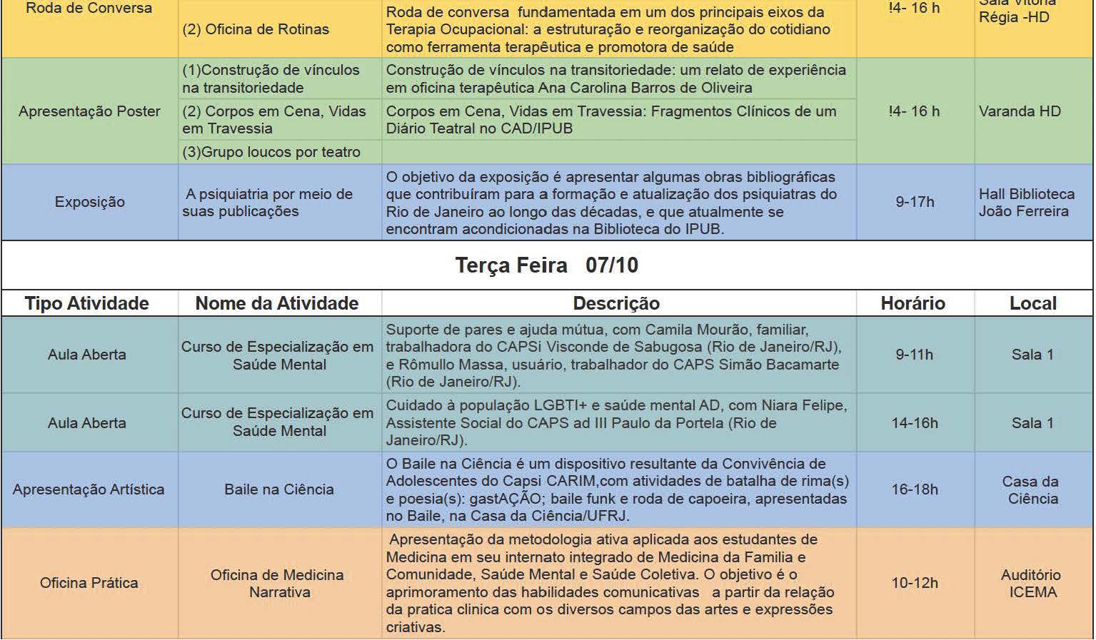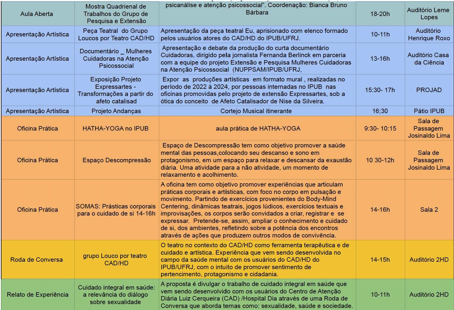 Entre os dias 6 e 10 de outubro, o IPUB abre suas portas com atividades gratuitas que unem ciência, arte e cultura.Durante cinco dias, mais de 50 atividades ocuparão os espaços do IPUB e do território da Praia Vermelha, reunindo práticas, saberes e iniciativas científicas, educativas e culturais sobre saúde mental. Exposições, exibição de documentários, apresentações artísticas, palestras, aulas abertas, rodas de conversa, oficinas e pôsteres integram a programação plural e diversa.